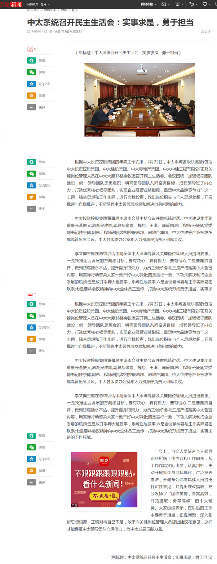 網(wǎng)易新聞報(bào)道了“中太系統(tǒng)召開民主生活會(huì):實(shí)事求是,勇于擔(dān)當(dāng)”