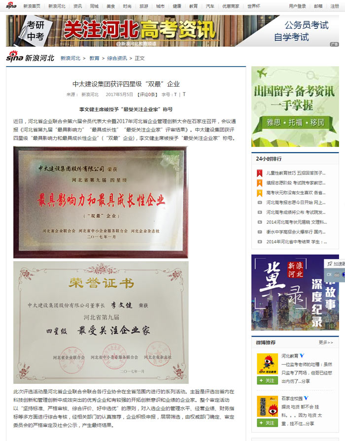 新浪網(wǎng)報道了“中太建設(shè)集團獲評四星級“雙最”企業(yè)”