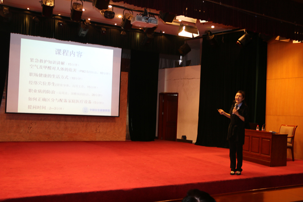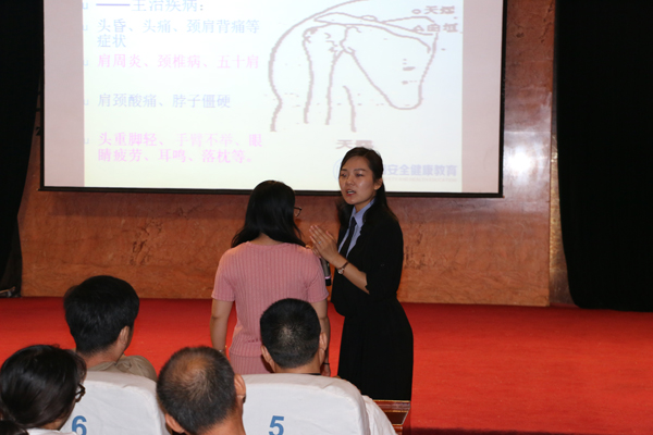 在中國環(huán)境健康與衛(wèi)生安全促進(jìn)會河北分會的大力支持下,中國安全健康教育中心河北站特邀講師,全民健康咨詢服務(wù)部,省健康教育專業(yè)委員會委員,宣傳科講師彭一茹走進(jìn)中太大廈,圍繞CPR現(xiàn)場緊急救護(hù)知識;環(huán)境污染、室內(nèi)污染的危害及防護(hù)知識;經(jīng)絡(luò)穴位養(yǎng)生;常見職業(yè)病的防治;家庭醫(yī)療設(shè)備的正確區(qū)分等內(nèi)容,從實(shí)際案例出發(fā),深入淺出、形象生動(dòng)的剖析健康的重要性以及穴位養(yǎng)生保健的方法,同時(shí)還邀請現(xiàn)場員工代表上臺,與老師合作為現(xiàn)場員工形象的解析了經(jīng)絡(luò)穴位治療的原理及療效。彭一如老師的精彩授課得到了在場員工的一致認(rèn)可。