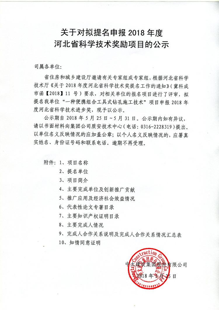關于對擬提名申報2018年度河北省科學技術獎勵項目的公示