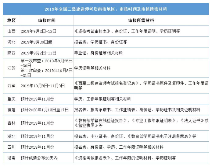 二建考試到現(xiàn)在已過了五月,大部分省市都已公布成績及合格標準。2019年有不少省市二建是有要求考后審核的。除了江西,其他地方怎么規(guī)定呢?以下是整理的二級建造師考后審核的地區(qū)及資料,供大家參考,希望對考生們有所幫助!(詳細信息以官方文件為主)