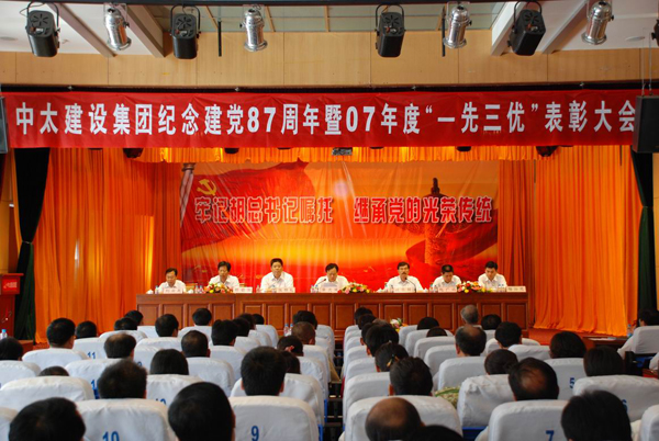 為了傳承黨的光榮傳統,激勵士氣、鼓舞干勁,進一步動員全體黨員職工,以中共中央總書記、國家主席、中央軍委主席胡錦濤同志視察集團公司為動力,把當前抗震救災凝聚出來的力量和精神,運用到實際工作中,轉化為推動企業向前發展的強大動力,團結一致、攜手并進,為全面完成好年初公司既定的各項任務指標、實現集團公司又好又快的發展而努力奮斗。6月28日上午,中太建設集團黨委在中太大廈二樓報告廳召開紀念中國共產黨成立八十七周年暨07年度“一先三優”表彰大會。集團黨委班子成員,受表彰的“一先三優”先進集體代表與優秀個人,集團公司總部,三個事業部全體黨員與全體員工,各黨支部班子成員與部分黨員、入黨積極分子共計200多人參加了表彰會。中太建設集團公司黨委副書記、監事會主席鐘崇鶴主持會議,集團公司黨委委員、總裁張明禮宣讀了表彰的先進黨支部、優秀共產黨員、優秀黨務工作者、優秀黨小組長名單,集團黨委書記、董事局主席李文健作了重要講話,。