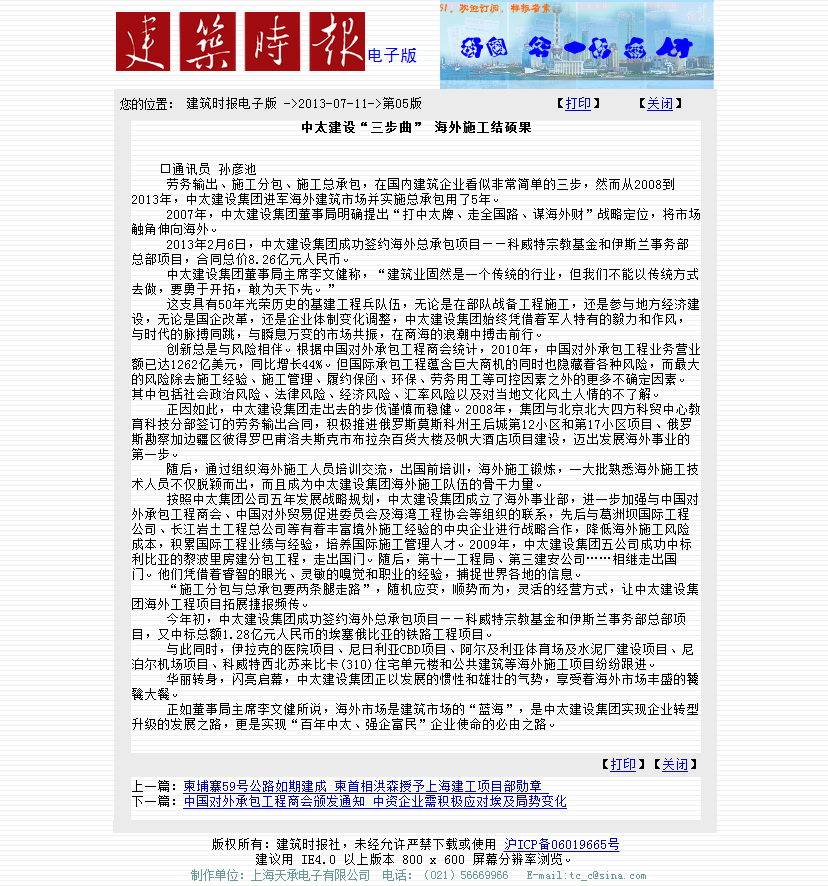 《建筑時(shí)報(bào)》7月11日第五版報(bào)道了中太建設(shè)集團(tuán)進(jìn)軍海外市場結(jié)碩果