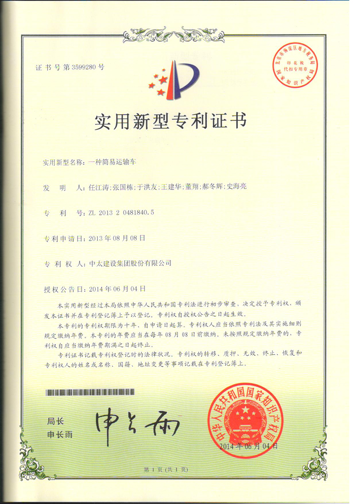 集團公司再獲一項實用新型專利《一種簡易運輸車》。至此,集團公司已累計獲得國家專利十五項,其中發(fā)明專利五項,實用新型十項。(企業(yè)技術(shù)中心 董翔)